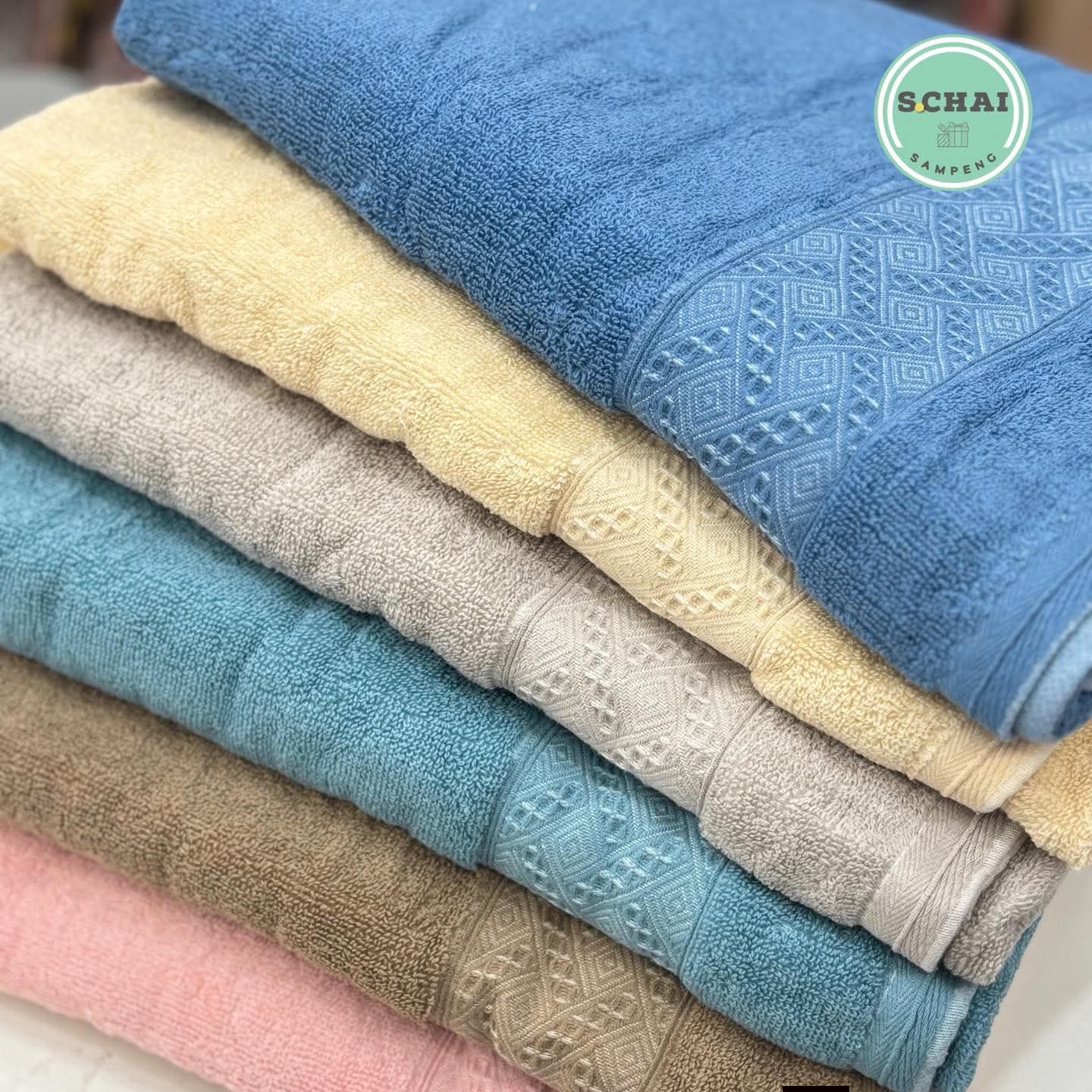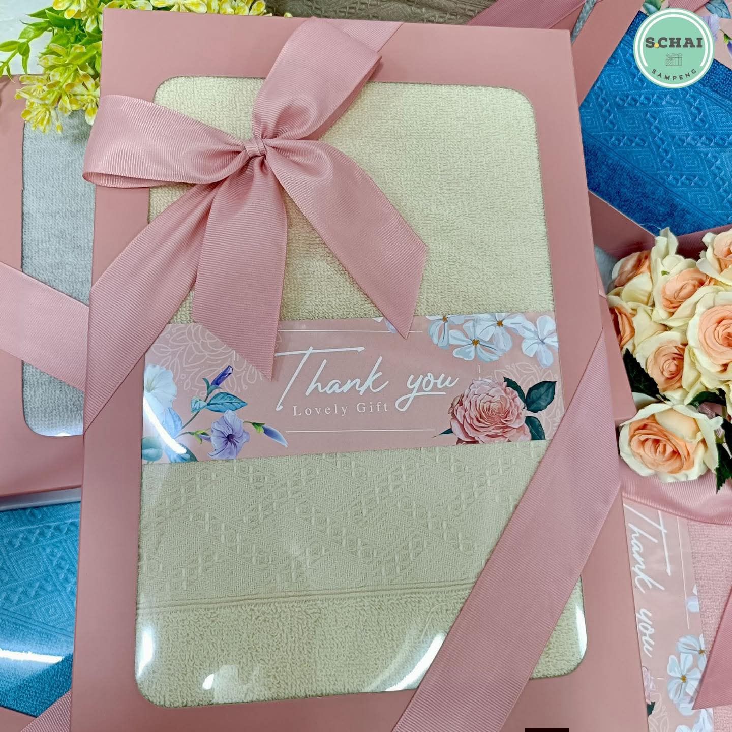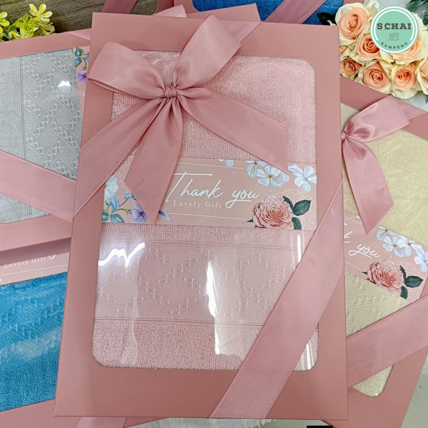 ขนาด 27x54 นิ้ว ซับน้ำได้ดีเยี่ยม พับใส่กล่องสีชมพูพร้อมผูกโบว์ ฟรีสติ๊กเกอร์